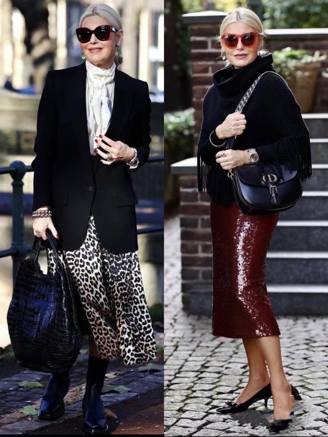 从来没有什么年龄应该穿什么样的衣服,只要大方得体、合乎身份和气质就可以大胆尝试不同风格。50岁的阿姨在穿性感野性的豹纹以及blingbling的亮片裙子时依然端庄优雅,用黑色上衣压住这些时髦单品的个性张扬,就能带来沉稳不乏高级感的气场。